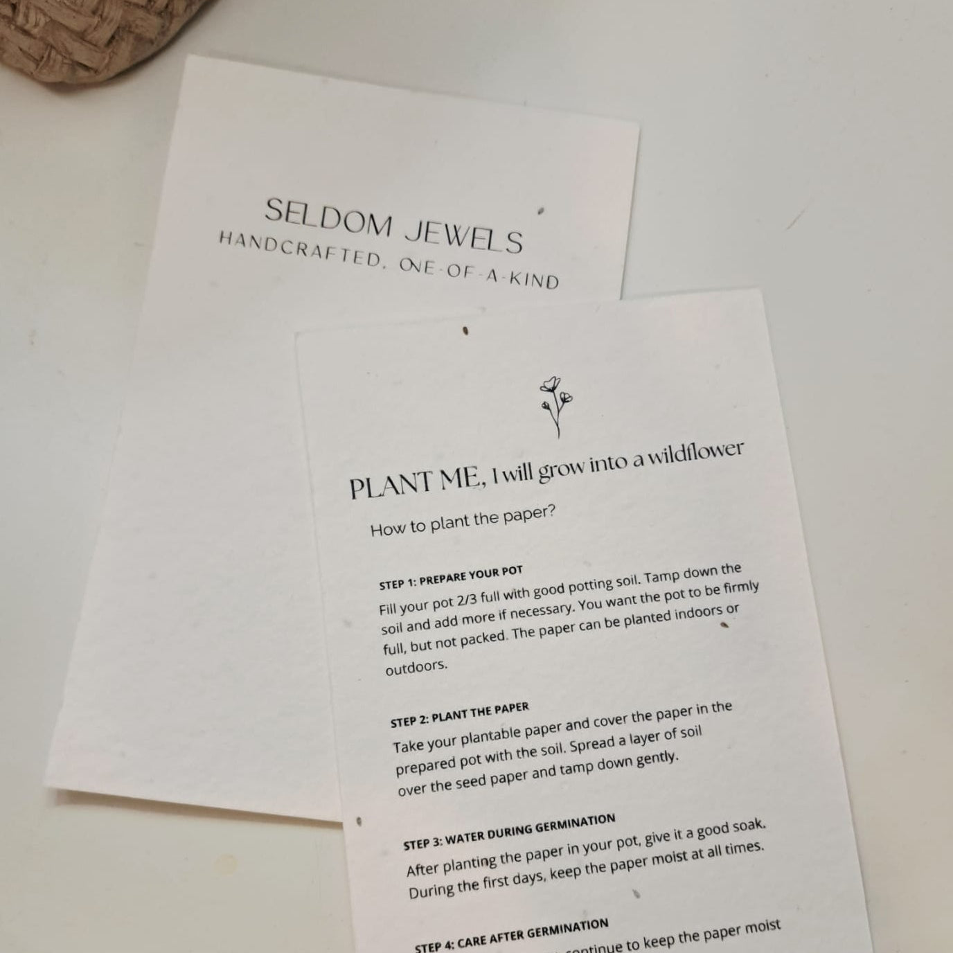 Cada collar de Seldom Jewels se entrega acompañado de un papel plantable, elaborado con semillas de flores silvestres. Una vez cumplida su misión, puedes plantarlo en una maceta y verlo transformarse en vida.