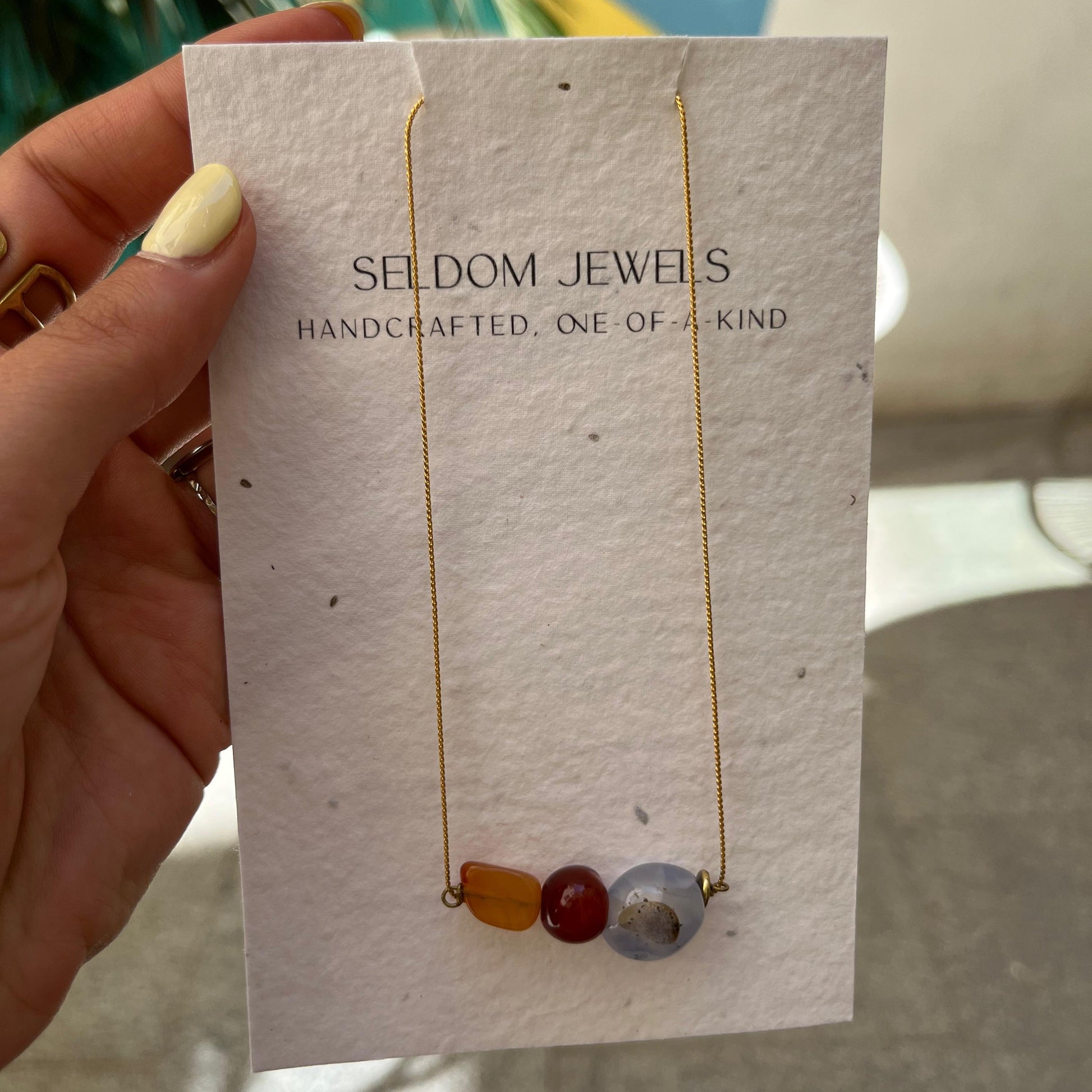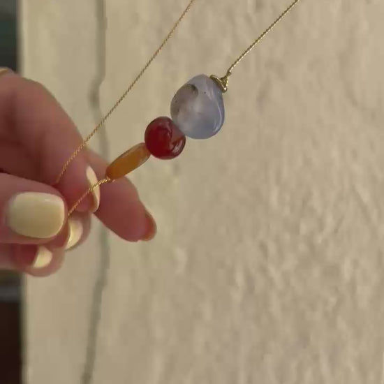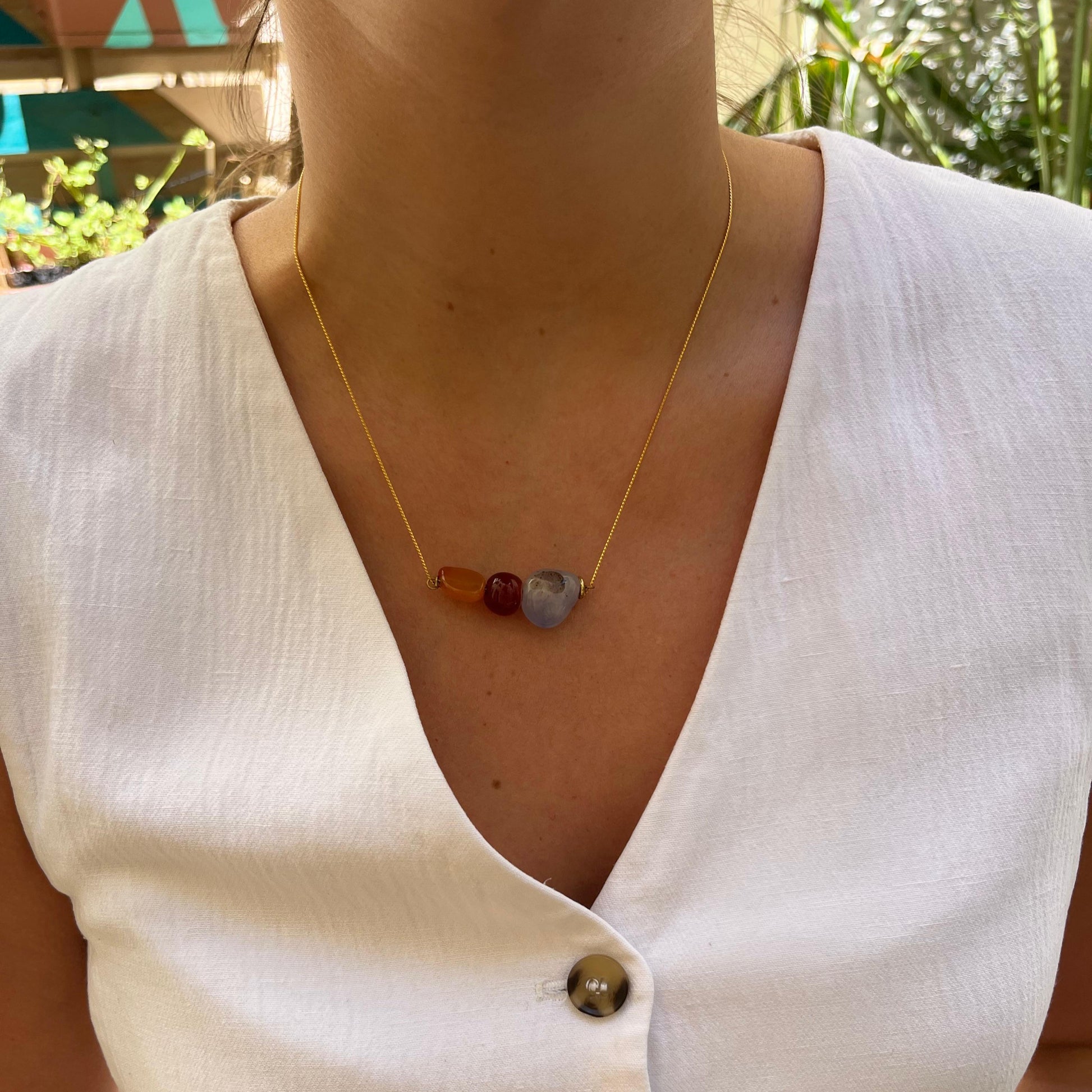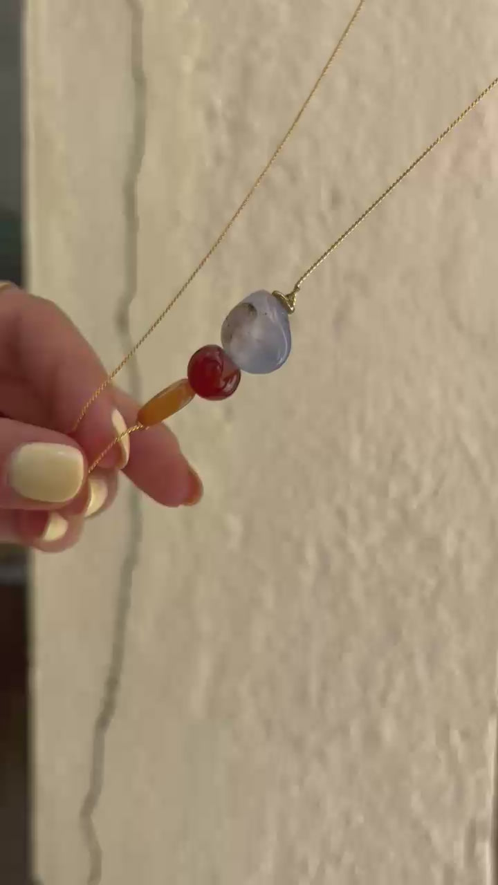 Este collar reúne tres piedras naturales que evocan los colores de la tierra y el cielo en calma: una ágata en tono ámbar, una cuenta central de color marrón cálido y una calcedonia azul con vetas naturales que aportan textura y profundidad. La disposición orgánica de las formas y la cadena dorada fina aportan equilibrio y sutileza a esta pieza de estilo sereno y atemporal.