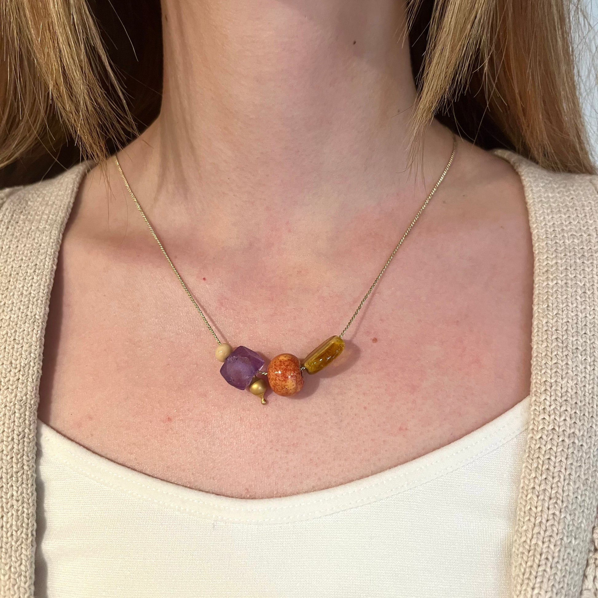 Este collar corto celebra la luz y la tierra a través de una combinación vibrante: una bola central de cerámica en tono caldera, flanqueada por cuentas de vidrio reciclado en violeta facetado y ámbar transparente. Pequeños acentos en dorado mate y marfil completan la composición, montada sobre una cadena dorada fina. Una pieza única, de presencia cálida y carácter luminoso.