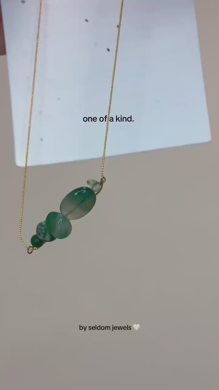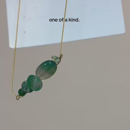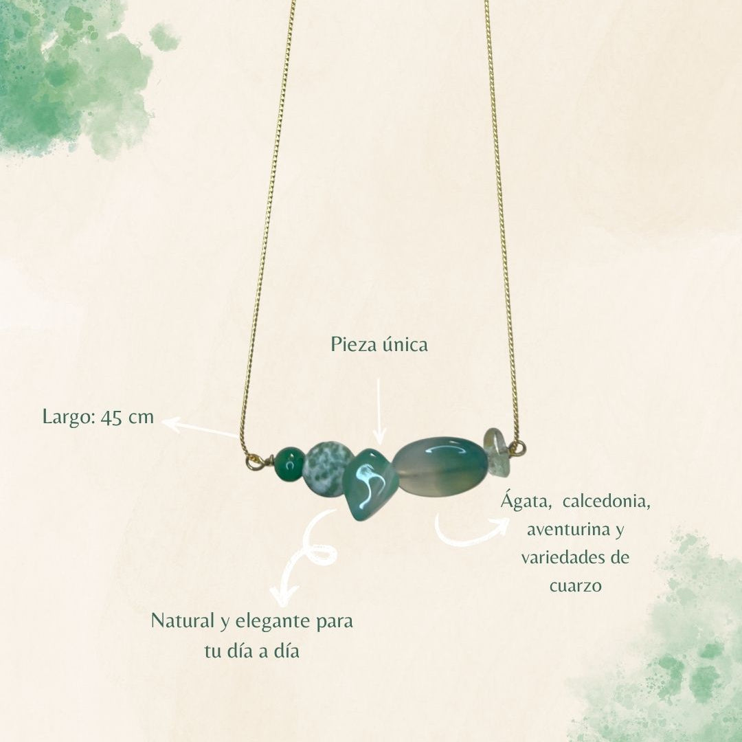 Collar minimalista con cadena fina dorada y piedras naturales en distintas tonalidades de verde. Cada collar es una pieza única, montada a mano con un diseño asimétrico que resalta la belleza natural de las gemas.